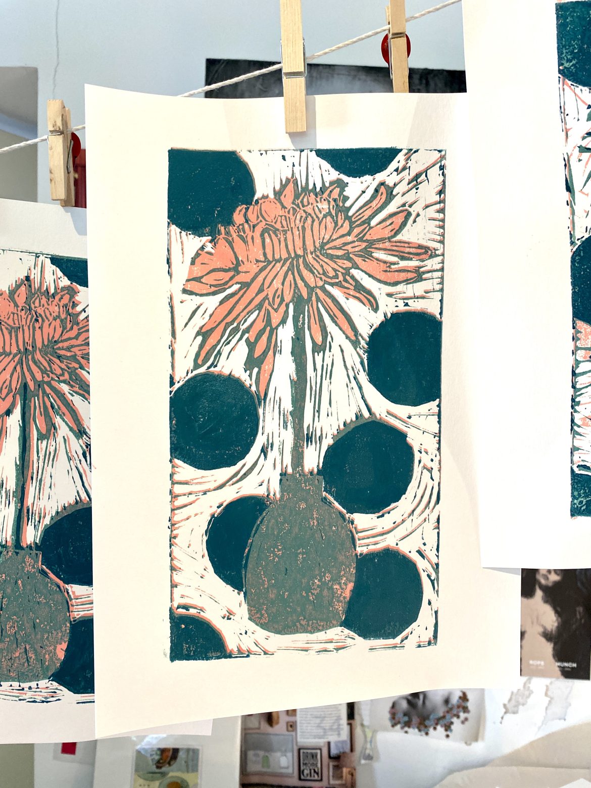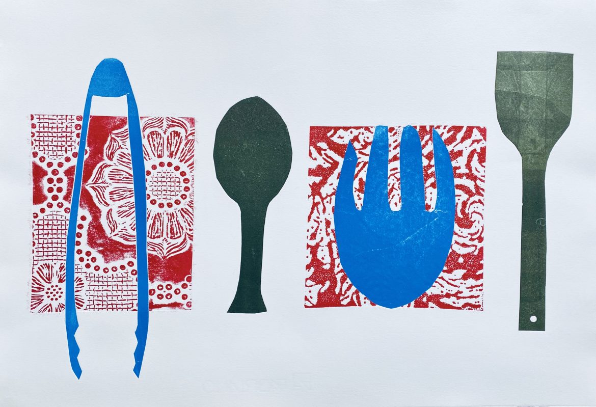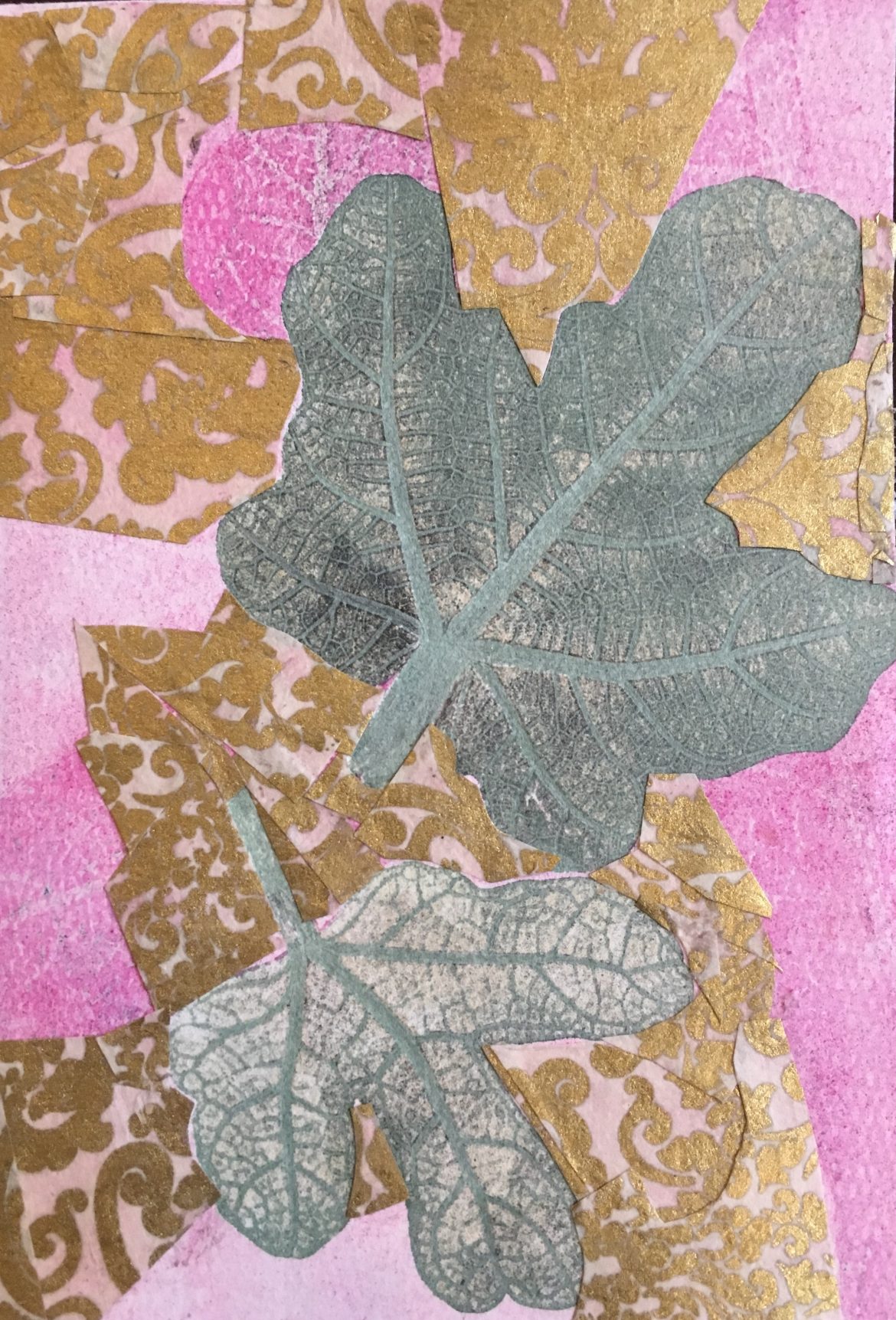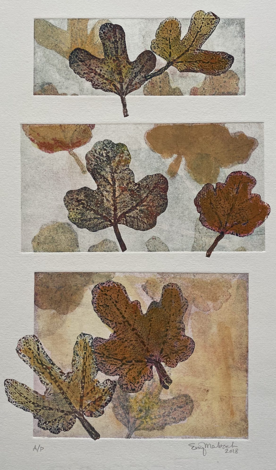 Emily Marbach is an American-born artist based in London, renowned for her mixed-media collages that blend printmaking, painting and found materials to create textured, narrative-rich works. Her art often features urban figures set against rural landscapes, exploring themes of conversation, silence, freedom, and slavery. She loves using feathers and leaves for relief printing. Linocuts are another favourite.