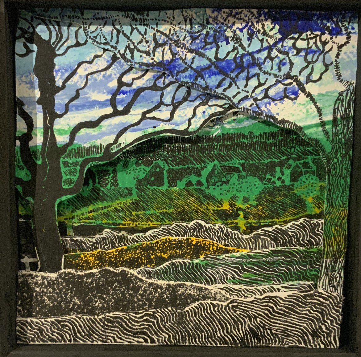 Linocut print cut and collaged into a box frame