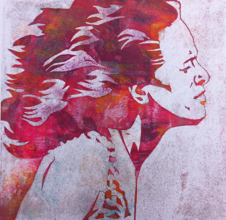 Sally Miles Rushing Woman in profile with hair flowing out behind. Red monochrome 30 by 30 cm Edition number: 3 VE