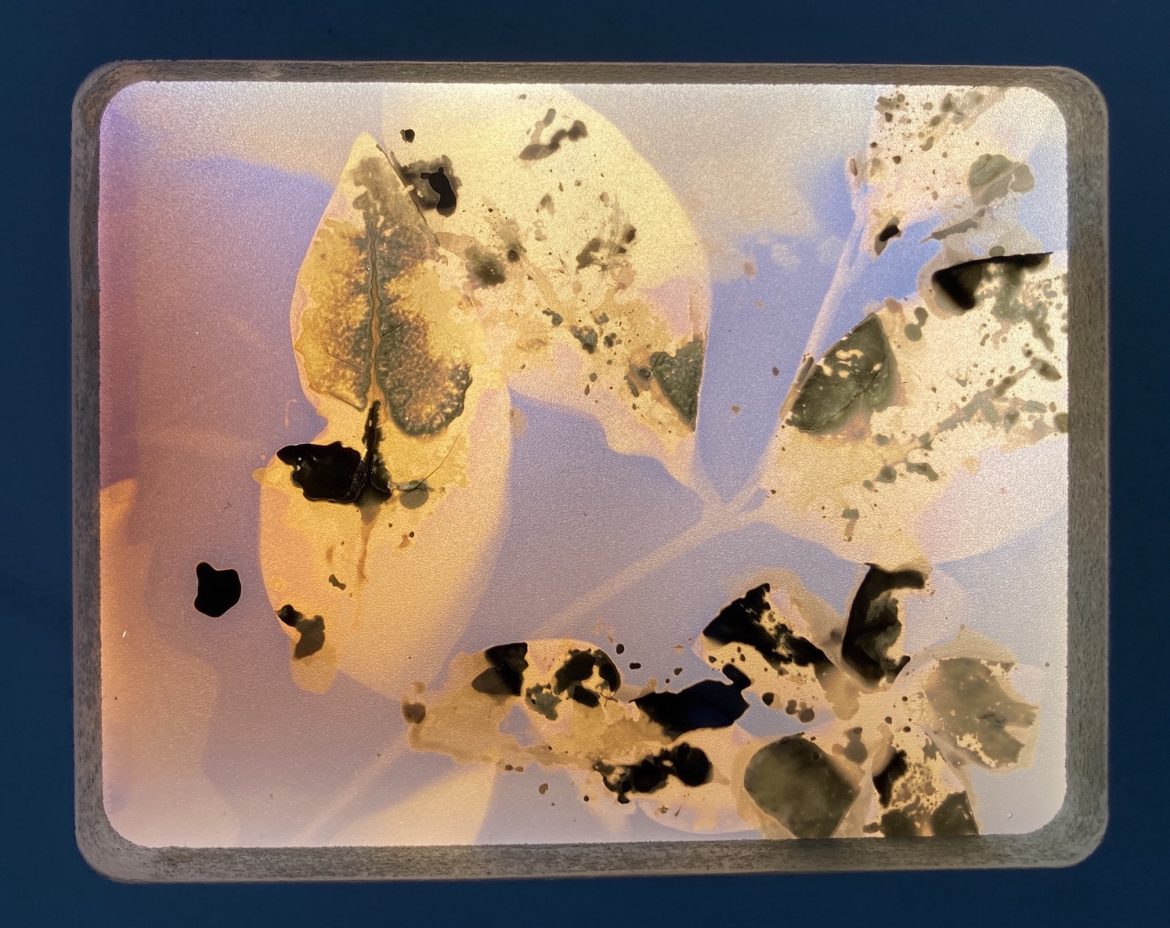 ‘Fade Away (Radiate)’ is a phytogram combined with a chemigram print, in which various plant and food substances were added to the light-sensitive paper to create resists and make marks, along with the plants.